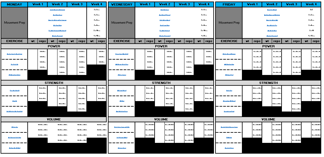 Each strength training day has: Movement Prep and Power/Strength/Volume Blocks.