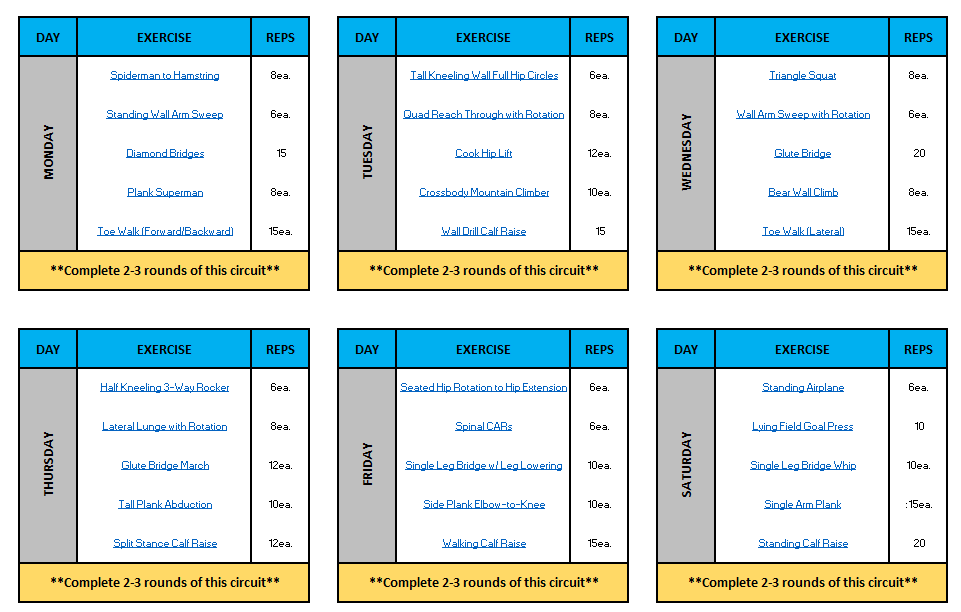 Each week has six short movement days that include: LB and UB Mobility, Glute Activation and Core Activation, and Calf Training